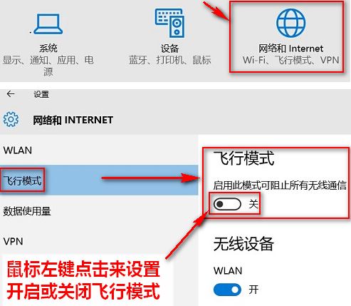 2.“飞行模式”设置为“开”状态,无线网卡及蓝牙等无线设备不会同时自动开启。无线网卡是否开启由无线设备“WLAN ”控制开关进行控制,若之前无线设备“WLAN”默认设置为“关”,则“飞行模式”打开后,无线设备“WLAN”还是“关”状态,需要手动设置到“开”状态,无线网络才能正常使用。若之前无线设备“WLAN”设置为“开”状态,则需要手动设置无线网络即可正常使用。
