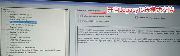 2。切换到高级启动选项,以检查右侧的启用旧式选项ROM选项,如图所示: