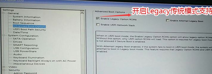 3。切换到高级启动选项,以检查右侧的启用旧式选项ROM选项,如图所示: