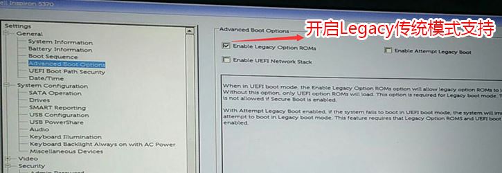 3。切换到高级启动选项,以检查右侧的启用旧式选项ROM选项,如下图所示;