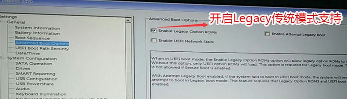 3。切换到高级启动选项,以检查右侧的启用旧式选项ROM选项,如下图所示;