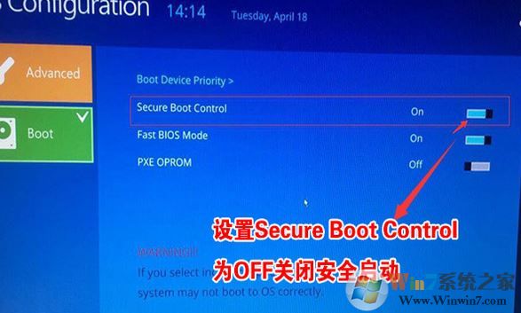 2。切换到启动选项,关闭Secure Boot Control的开关(打开),然后关闭安全启动。如下图所示,此步骤是修改Win7的重要步骤。
