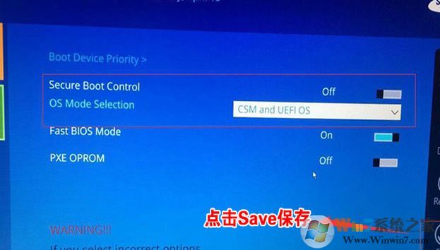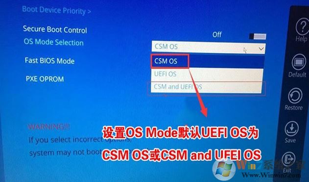 3。关闭安全启动后,启动选项中将有一个额外的OS MDOE选择选项。如下图所示,我们将默认的UEFI OS更改为CSM OS或CSM和UEFI OS。