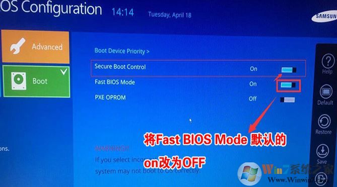 4。在快速BIOS模式后面关闭开关(如下图所示);
