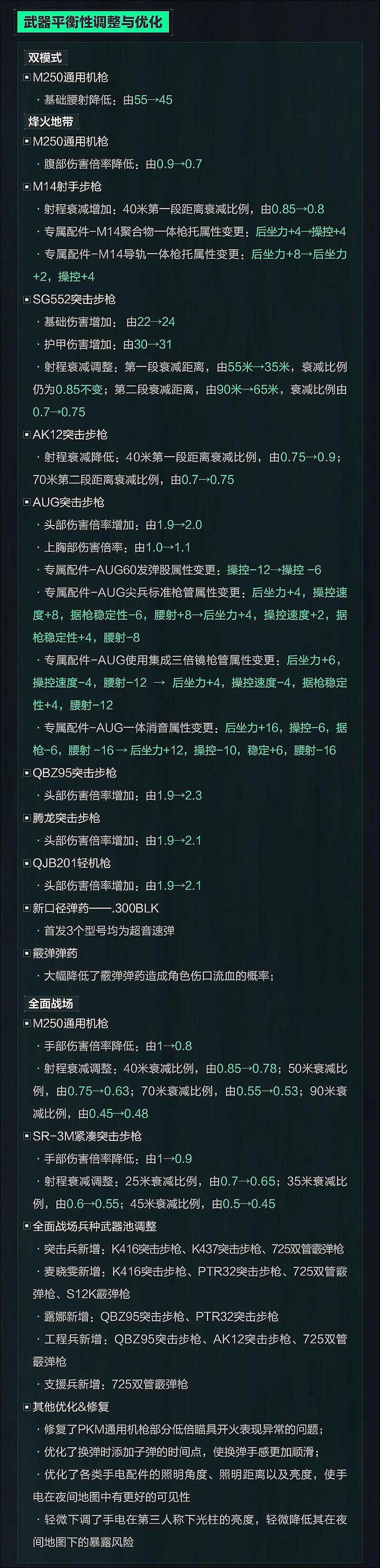 SG552突击步枪的基本损坏已从22增加到24,装甲损坏已从30增加到31,其输出能力得到了显着提高。在范围衰减调整期间,第一部分的衰减距离从55米缩小到35米,第二部分从90米缩小到65米,衰减比也会变化。这种调整使SG552在中档战斗中更具威胁性。 AK12突击步枪的范围衰减比从40米的截面中从0.75增加到0.9,在70米的截面中从0.7增加到0.75,并且优化了远程战斗性能。 AUG突击步枪的头部伤害比从1.9增加到2.0,上胸部从1.0增加到1.1,大大提高了关键部位的产出效率。在独家配件方面,Aug60圆形鼓的控制属性从-12调整为-12至-6,并且还重新平衡了先锋和集成的三镜枪管的标准桶的性能,并且需要根据战斗距离灵活选择配件。