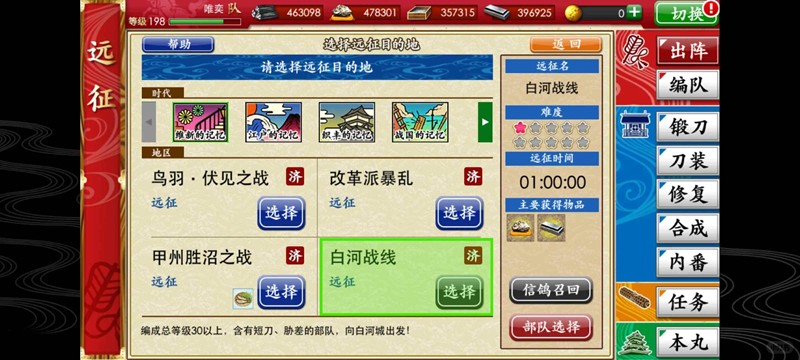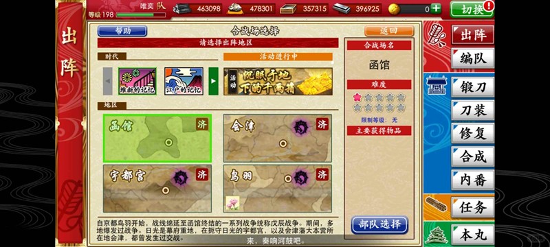 主线:总共有8张图片,每张图片分为4个小图片,如图片Hakodate的第一张小图片,称为1-1。图6和7-4是特殊的夜间战斗,需要短刀形成。