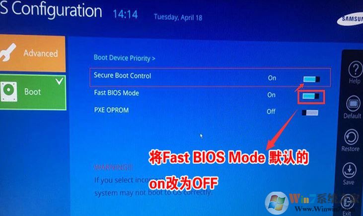 4。在快速BIOS模式后面关闭开关(如下图所示);