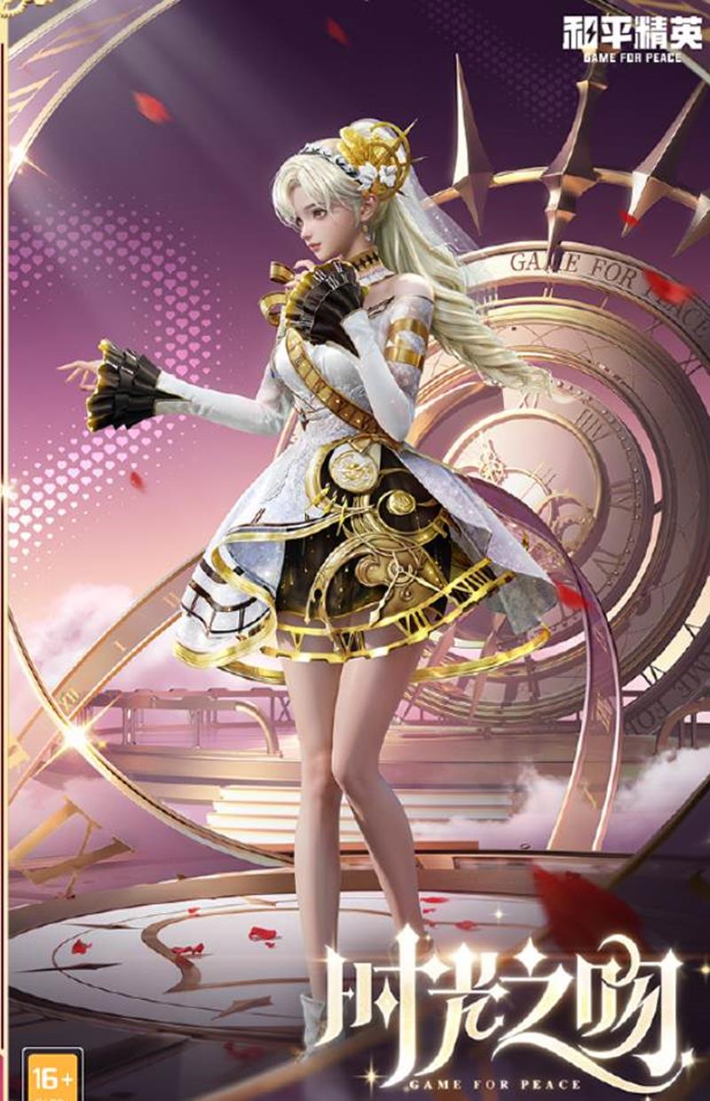时光之吻皮肤外观面介绍时光之吻:女性角色的皮肤的整体风格甜美华丽,白色和浅粉红色为主要颜色,并配以金色时钟齿轮图案。蕾丝设计与衣服和袖口的下摆分层,使其看起来特别梦幻。一条金色的腰带,腰间镶嵌有宝石,配有略带卷发的长发和钟发配件,显示出甜美而迷人的公主气质。