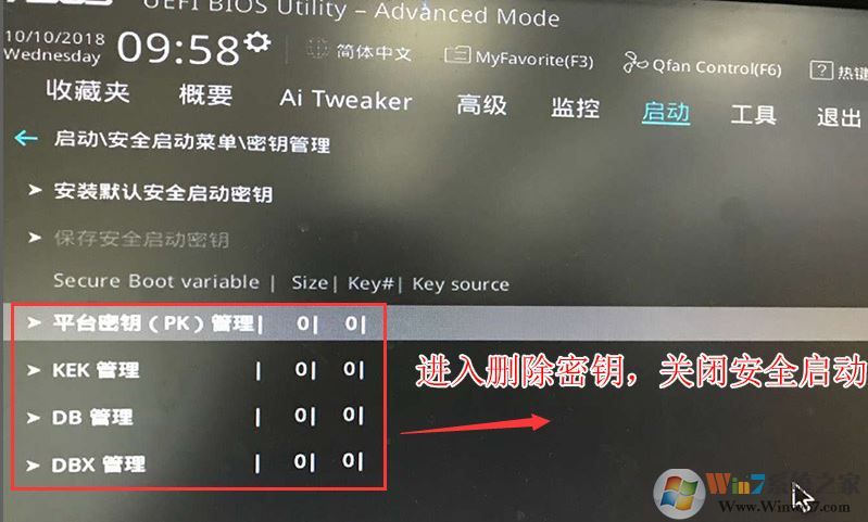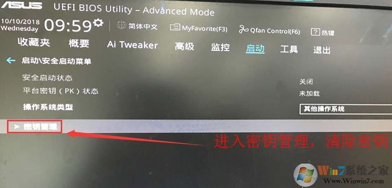 2。输入高级模式后,按箭头键移动到“开始”选项,选择“安全开始菜单”,然后输入键管理以清除键以关闭安全启动,如以下4个图片所示: