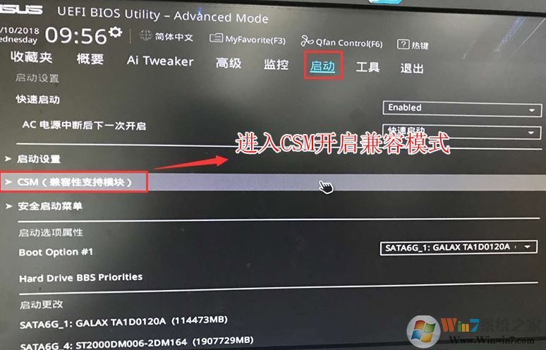 4。返回“开始”选项,将CSM从禁用到启用,并启用兼容模式,如下图所示;