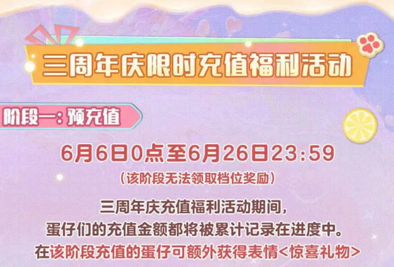 这个Eggie派对的第三周年纪念日分为两个阶段。 6月6日至6月26日是预回时期。在此期间,您可以获得100的回扣,还可以获得其他有限的表达《惊喜礼物》。从6月27日至7月10日,奖励收集期是30元的总充值,以解锁有限的双人车辆“糖果热气球”。这辆车不仅具有可爱的外观,而且还需要两个人协作操作,使其非常适合朋友或夫妻使用。
