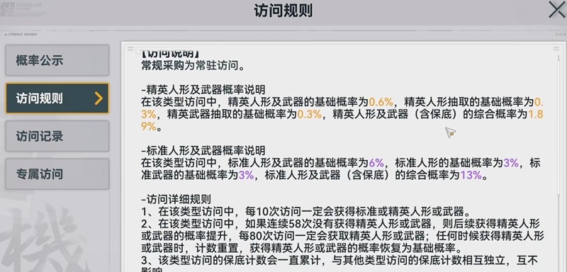 在连续58次获得精英质量之后,随后的卡绘制概率将逐渐增加。精英质量的难道设置为80平局。应当指出的是,无论您如何获得精英质量,概率增加状态都将立即重置。与类似游戏相比,在女孩前线2中绘制卡片的概率相对透明,但是在大多数情况下,您仍然需要依靠保证的机制来获得自己喜欢的精英素质。