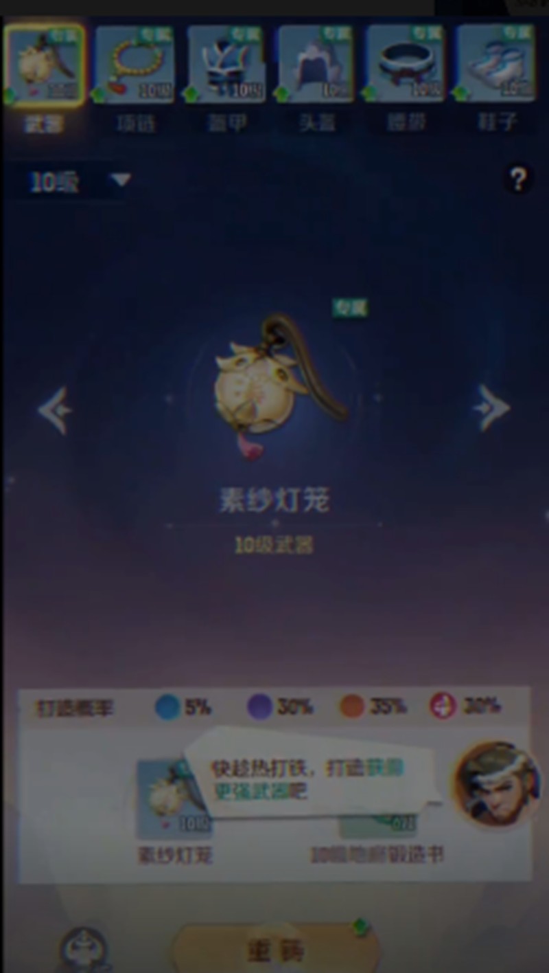 在设备创建界面中,玩家可以选择要创建的设备类型。例如,10级武器普通纱线灯笼将在建造之前显示设备质量不同的输出概率。在施工过程中,您应该注意收集足够的材料。材料的质量越高,创建高质量设备的机会就越大。