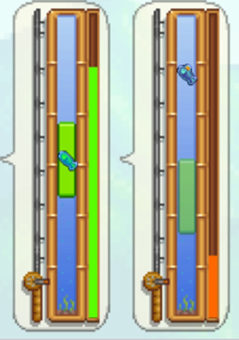 钓鱼是一款需要技能的小游戏。玩家需要通过单击来控制绿色进度栏,以使其覆盖游泳鱼。不同的鱼有自己的运动模式。例如,鲤鱼将保持静止,而鲈鱼喜欢快速上下移动。捕捞技能水平越高,进度栏的时间越长,操作误差率越高。为了提高钓鱼水平,您主要依靠更多钓鱼来积累经验,并且还可以通过吃鱼汤和其他菜肴获得临时奖金。