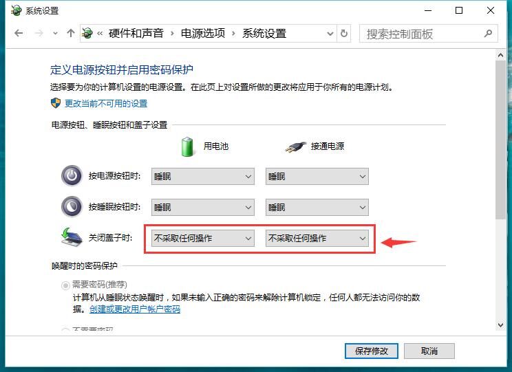 4、最后我们点击“保存修改”,这样就完成了自定义笔记本合盖时的功能了