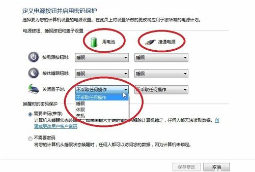3、第三排就是用于设置合盖(关闭盖子)时的功能,在下拉菜单中,我们可以选择睡眠、休眠、关机或者不采取任何操作,注意这时还分为接通电源和不接通电源时的状态哦,可以根据需求进行设置操作: