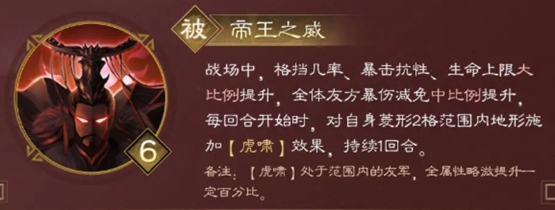 孙奎恩(Sun Quan)的才华横溢的技巧,即皇帝的力量,是其核心特征之一。这项技能可以大大增加太阳量在战斗过程中的阻塞机会和关键的阻力,同时增加了生活的上限。更重要的是,这种人才还可以为所有友好力量提供爆炸性损害的效果。在每一轮比赛的开始,太阳量还可以在两个钻石网格中应用老虎咆哮的地形效应,以创造出良好的战斗环境。
