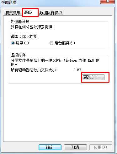 4、然后在“高级”选项卡下,点击“虚拟内存”处的更改;