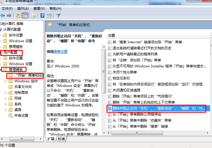 2。然后在左侧的列表中找到“用户配置” - “管理模板” ——“”任务栏和“开始菜单”,并在右侧的列表中找到“删除和块访问“关闭”,“关闭”,“重新启动,睡眠和冬眠”命令“”;