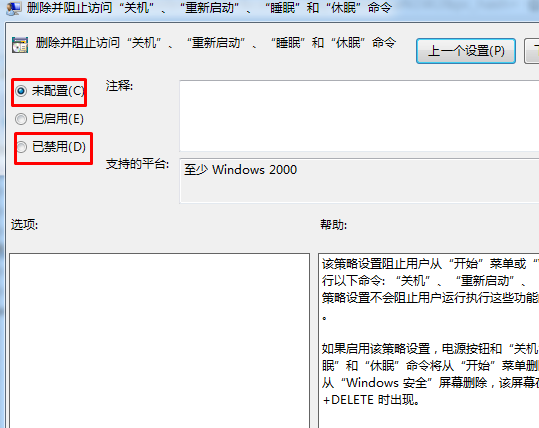 3.双击“删除和块访问'关闭”,重新启动,睡眠和休眠命令“选项”选项,将策略设置为“禁用”,然后确认。