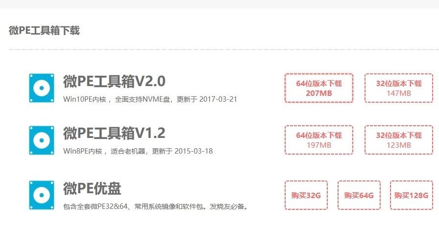 2、下载Windows PE维护系统,这里以使用最新的微PE工具箱 v2.0 64位版本为例,如果已经下载可跳过此步。建议选择WePE V2.0 64位版,它新增了对NVMe磁盘的支持。