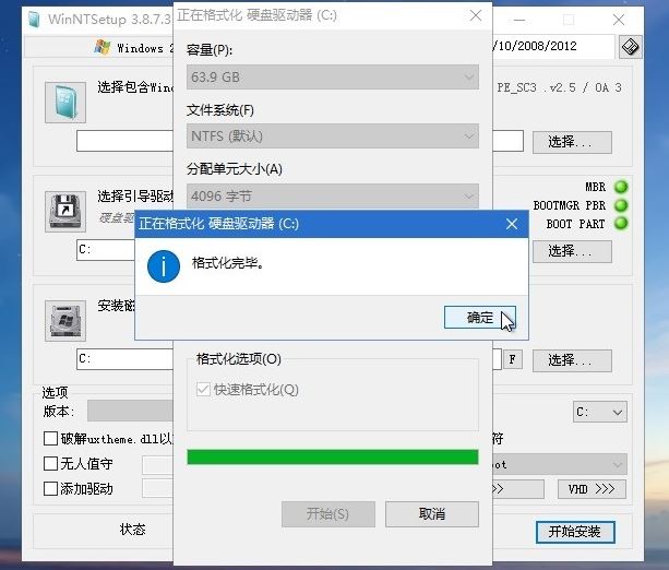 7、备份转移好C盘内重要文件,然后运行PE桌面上的“Windows安装器”,在“安装磁盘的位置”处确定选择为“C盘”,点击右侧的"F"按钮打开格式化窗口,确定“文件系统(F)”选择为“NTFS”,“分配单元大小(A)”选择为“4096字节”,点击“开始(S)”格式化等待完成后确定“关闭(C)”。