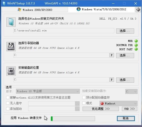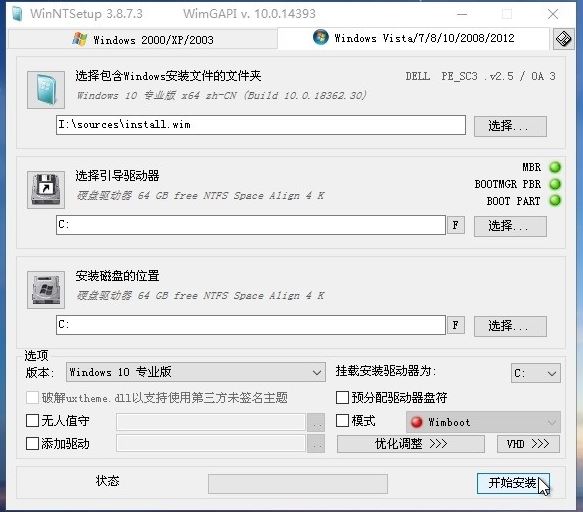 8、定位到“选择包含Windows安装文件的文件夹”项点击“选择”按钮,在弹出窗口中找到刚才挂载的“虚拟光驱盘符:\sources\install.wim”文件并点击“打开”按钮完成选择。定位到“选择引导驱动器”项点击“选择”按钮将弹出打开窗口,对于Legacy+MBR组合需找到“活动分区”(一般为C盘)并点击“选择文件夹”按钮完成选择;对于UEFI+GPT组合需找到“ESP分区”(运行WinNTSetup后自动挂载出来的盘)并点击“选择文件夹”按钮完成选择。定位到“安装磁盘的位置”项点击“选择”按钮,在弹出窗口中找到“C盘”并点击“选择文件夹”按钮完成选择。在选项区域中点击“版本:”下拉菜单根据需要自行选择,这里将以“Windows 10 专业版”为例,选择好后如果检查了没有问题就点击“开始安装”按钮继续下一步操作。