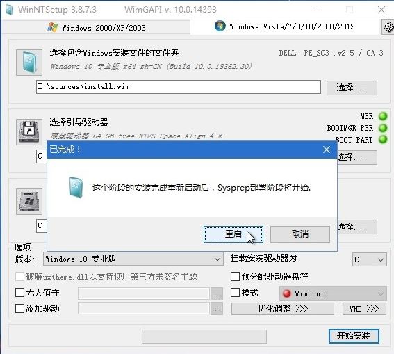 11、当弹出“已完成!”提示框时直接点击“重启”按钮即可,如果此时系统不能重启请手动打开“开始菜单”并点击“重启”按钮完成重启操作。