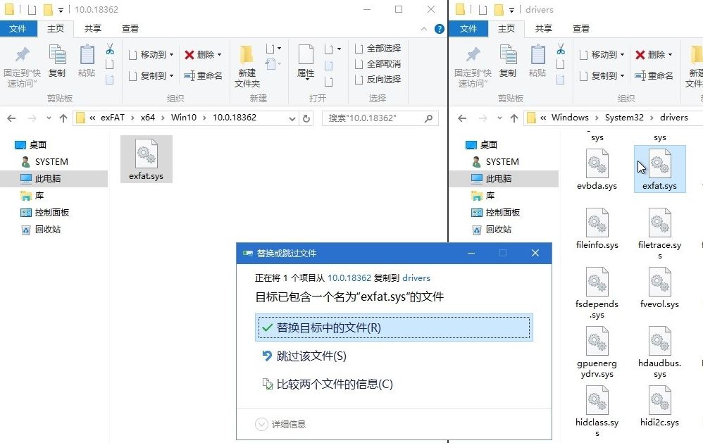 14、进入PE系统后解压下载的“exFAT驱动.zip”压缩包文件,然后根据你安装的系统版本选择并打开对应的文件夹(这里为19H1 RTM即对应版本18362),再将其中的“exfat.sys”文件复制粘贴到“C:\Windows\System32\Drivers”文件夹内并替换掉原文件。