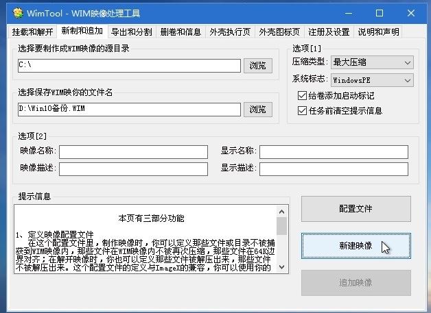 16、点击“新制和追加”选项卡,在“选择要制作成WIM映像的源目录”处点击“浏览”按钮,选择“整个C盘”并点击“确定”按钮。在“选择保存WIM映像的文件名”处点击“浏览”按钮,选择点击“除C盘外”的其他盘可在任意目录输入自定义文件名并点击“保存”按钮。在选项[1]区域中的“压缩类型”下拉菜单选择为“最大压缩”。在选项[2]区域中的四个“文本框”内可以自由设置备注信息或者直接留空即可。选择好后如果检查了没有问题就点击“新建映像”按钮继续下一步操作。