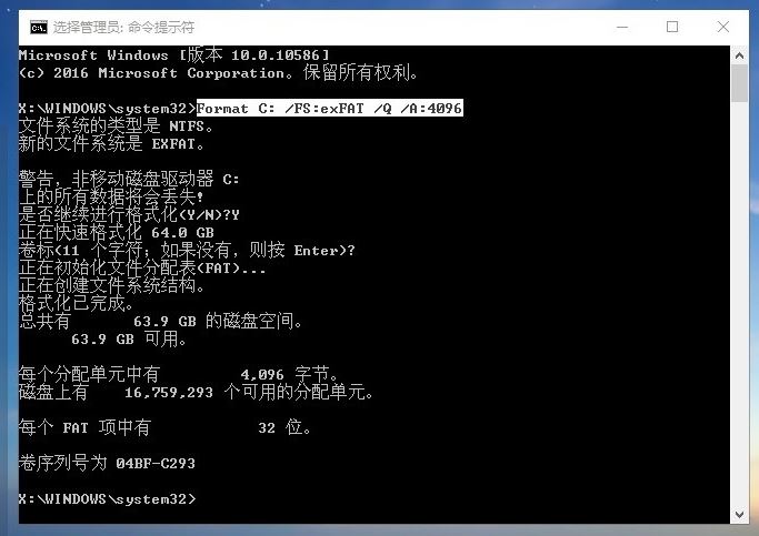 19、点击并打开 开始菜单→命令提示符,注意空格输入“Format C: /FS:exFAT /Q /A:4096”不包含引号并按下Enter回车键,当提示是否继续格式化时按下“Y”键并回车,当提示设置卷标时可自行设置或直接回车留空,当提示格式化完成信息后此时C盘已成功格式化为exFAT文件系统。