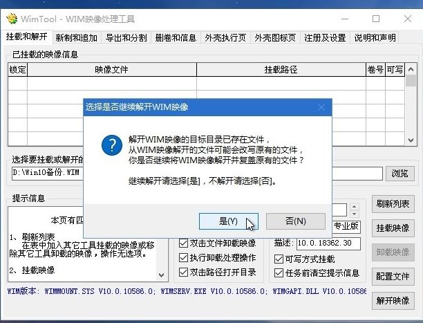 21、如图所示如果弹出“选择是否继续解开WIM映像”对话框则点击“是(Y)”按钮以继续操作。