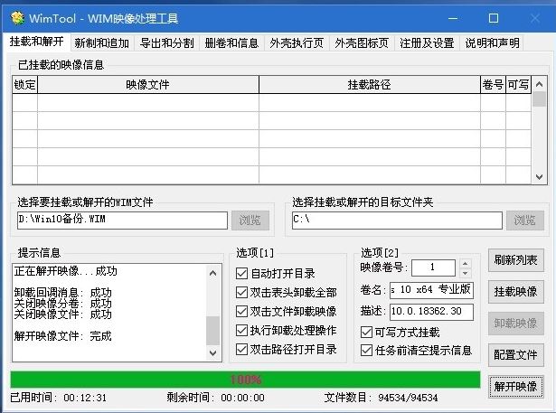 20、回到WimTool,点击“挂载和解开”选项卡,在“选择要挂载或解开的WIM文件”处点击“浏览”按钮,选择之前保存好的“WIM映像文件”并点击“打开”按钮。在“选择挂载或解开的目标文件夹”处点击“浏览”按钮,选择“整个C盘”并点击“确定”按钮。选择好后如果检查了没有问题就点击“解开映像”按钮继续下一步操作。