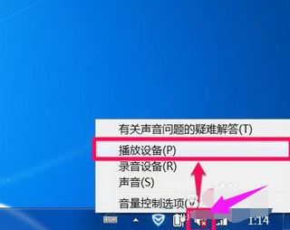 4、在设备管理器中的声音设备驱动是好的,则是系统设置有问题,右键点击任务栏小喇叭图标,选择“播放设备”。