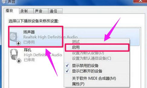 6、出现“扬声器”和“耳机”选项,这时要在“扬声器”上右键,然后点击菜单中的“启用”。
