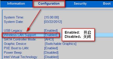 5.在电脑开机自检时连续敲击F2键(或Fn+F2组合键)进入BIOS。使用键盘左右方向键选中Configuration菜单项,即可找到“Wireless LAN Support”无线开关选项。