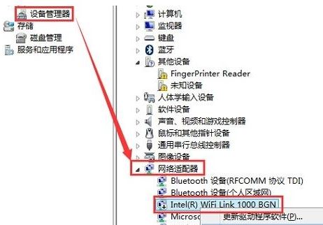 4.在桌面上此电脑的图标上点击鼠标右键点击管理,进入计算机管理界面,点击设备管理器,右侧会出现一项为“网络适配器”的选项,可以在无线网卡的设备上,点击鼠标右键选择启用,如下图所示: