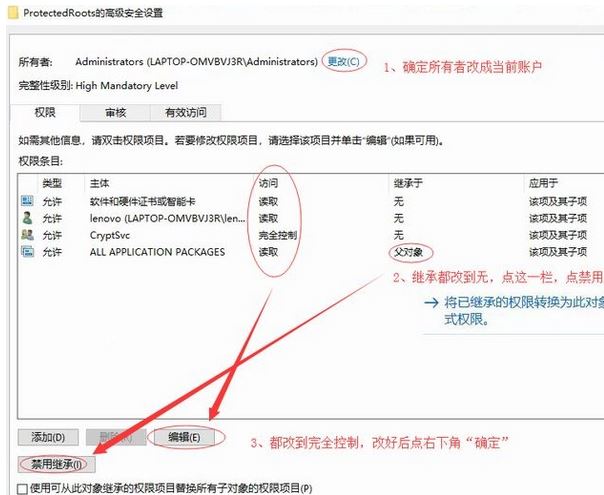 7、如果出现“无法保存对ProtectedRoots 权限所作的更改”,请用步骤2的方式删除