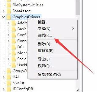 3、右键点击GraphicsDrivers注册表项,在弹出菜单中选择“查找”菜单项,如图:
