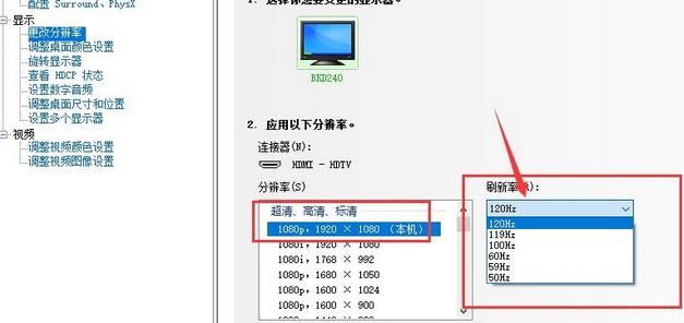 4、在nvidia控制面板左侧 显示 --更改分辨率,右侧查看 分辨率选项中的“刷新率”是否有144,如果没有继续往下看如图:
