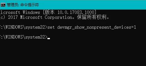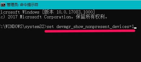 2、当set devmgr_show_nonpresent_devices=1命令粘贴好以后,我们按下键盘上的回车键,如图: