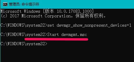 1、在管理员命令提示符窗口执行set devmgr_show_nonpresent_devices=1命令和Start devmgmt.msc 命令,如图所示: