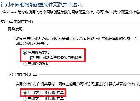 3、当前网络类型:专用配置下点击【启用网络发现】和【启用文件和打印机共享】;