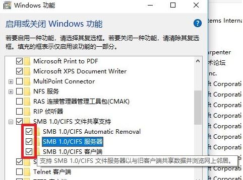 13、在windows功能界面展开SMB1.0/CIFSAutomaticRemoval,然后将下面的3个SMB选项全部勾选,点击确定;