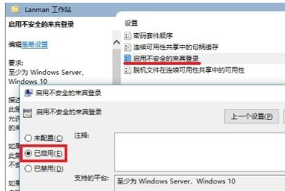 17、在右侧打开【启用不安全的来宾登录】选项,点击【已启用】,点击【应用】--【确定】保存设置!