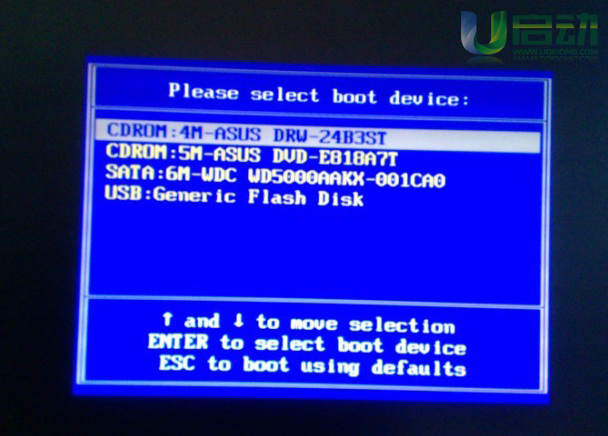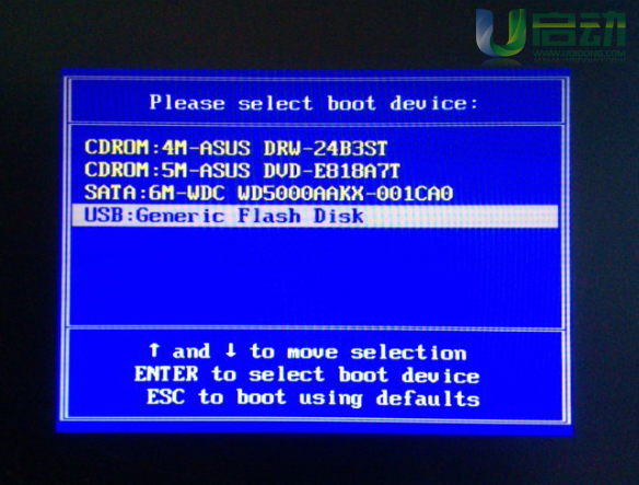 大家看下图,将光标移动选择到的地方显示“USB:Gener ic Flash Disk”(u启动小编写这篇教程的时候使用的是u盘)所以,当我们按下快速热键F8的时候显示出来的选项中就包含有小编用u启动制作好启动盘的u盘。
