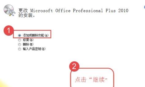 4.、在弹出的窗口中,选择“添加或删除功能”,然后点击“继续”;