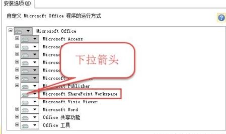 5、找到“Microsoft SharePoint Workspace”然后单击前面的下拉箭头,选择“不可用”,最后点击“继续”,如图: