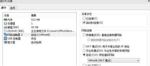 4、虚拟机”-“设置”-“网络适配器”-“自定义特定网络”-“VMnet8(NAT模式)”-“确定”。