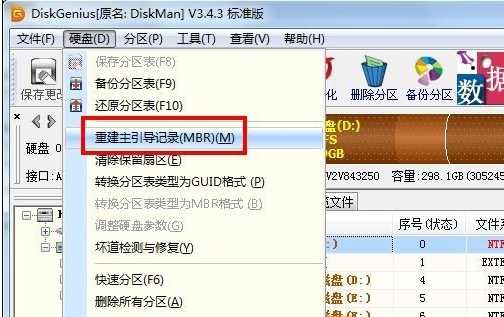 3、点击diskgenius菜单栏 硬盘——重建主引导记录